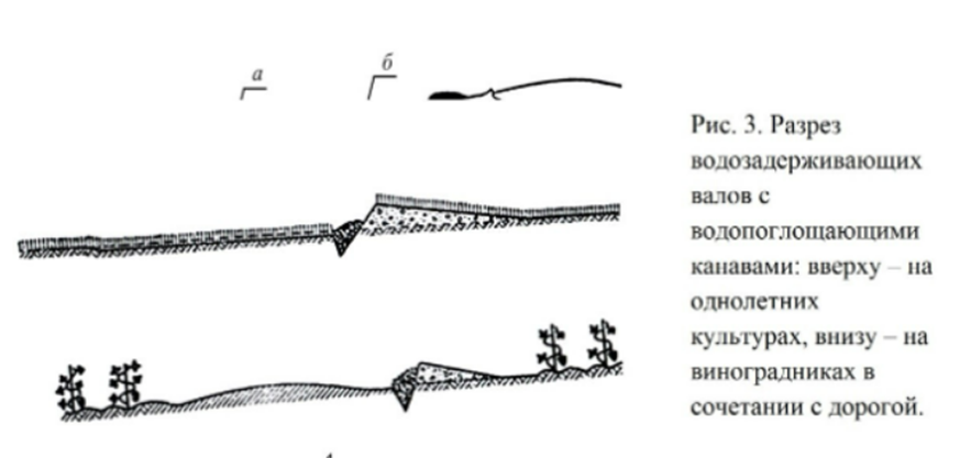 - Валоканавы: водопоглощающие канавы, заполненные органическими материалами (солома, стебли подсолнечника), расположенные по горизонталям.