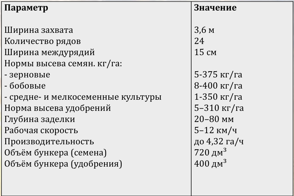 Сеялка может быть использована для посева семян других культур, близкими к зерновым по размерам семян и нормам высева (гречиха, просо, сорго, рис и др.), а так же для посева мелкосеменных культур (рапс, рыжик, и др.), с нормами высева от 1 кг/га.