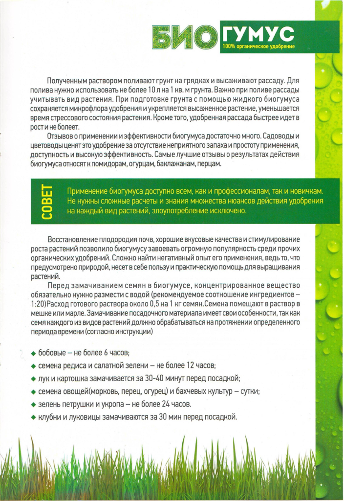 Специалисты рекомендуют применять экстракт биогумуса не только для подкормки растений, но и для замачивания самого семени перед посадкой. Активные компоненты вещества способствуют раннему проклевыванию молодых росточков, их быстрому проращиванию, ускорению схожести и увеличению урожайности в будущем.